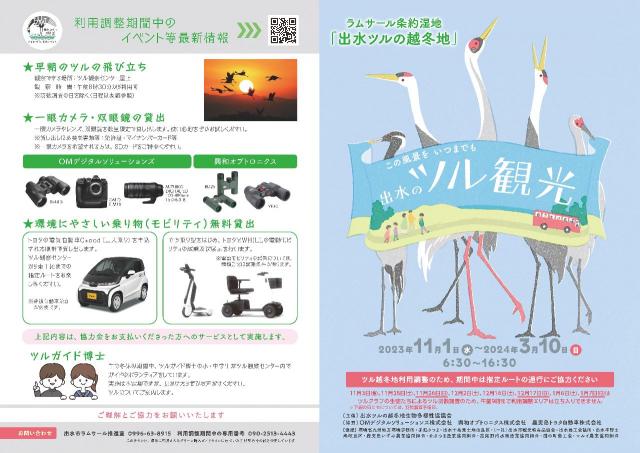 ※11月3日(金)、11月25日(土)、11月26日(日)、12月2日(土)、12月16日(土)、12月17日(日)、1月6日(土)、1月7日(日)はツルクラブの生徒たちによるツル羽数調査のため、午前9時まで利用調整エリアに立ち入ることができません。(赤字はツル羽数調査予備日)